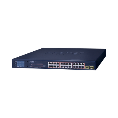 Switch PoE de 24 Puertos Gigabit 802.3af/at con Modo Extendido 250 m, 2 Puertos SFP 1000SX , Pantalla LCD para Configuración Básica, Hasta 300 W para PoE